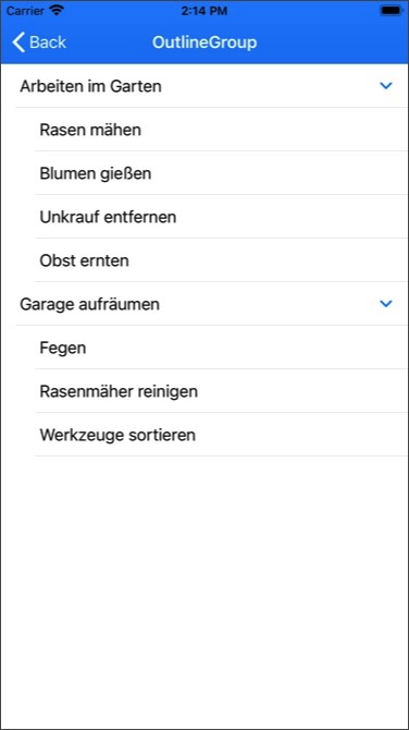 Die Definition der Datenhierarchie beansprucht den größten Teil des Programcodes in diesem Beispiel. Die Programmierung der OutlineGroup ist hingegen einfach. Es genügt eine ForEach-Schleife in einer List, die für jede Aufgabe eine OutlineGroup erzeugt.